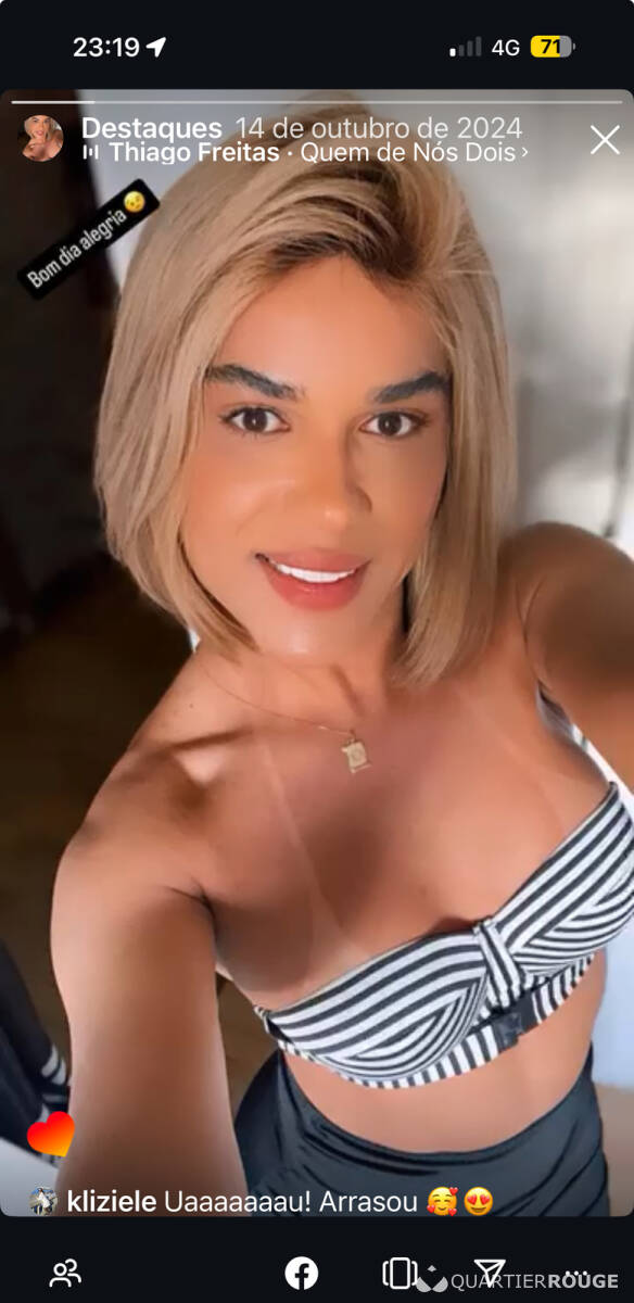 Il! Je suis une belle TRANS brésilienne, très chaude, très douce, toujours de bonne humeur, souriante et élégante, ouverte de culture, je vous invite à passer des mémorables et inoubliables, des massages en ma compagnie! Je vous attends ! Je vous invite à voir ma photo qui dit d'elle : tout à fait naturel, je déteste la vulgarité et le manque de respect. J'adore la lingerie et la féminité ! Détails sur les services que j'offre Pénétration active et passive, 69, fellation, position, massage et bien plus encore pour que nous nous sentions à l'aise